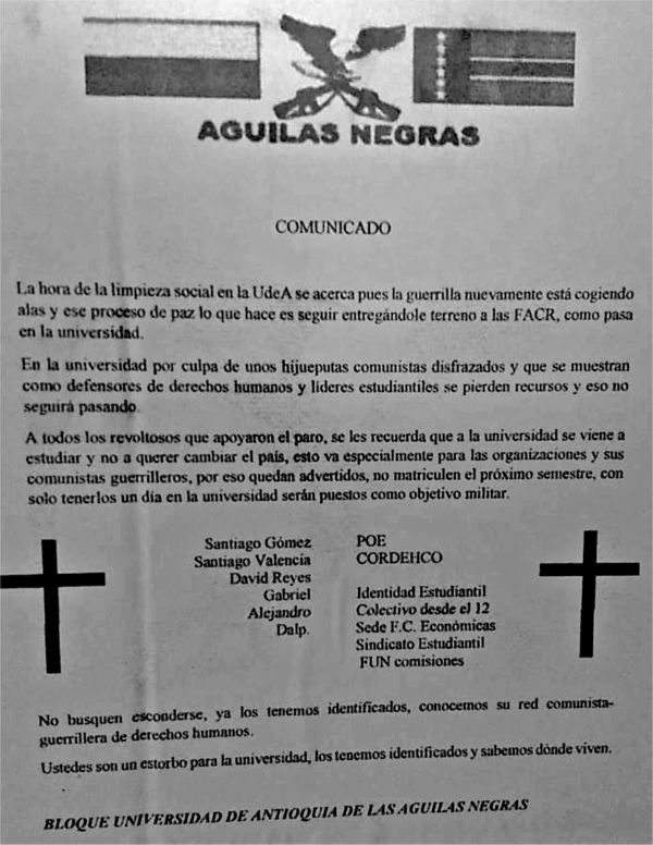 - En este comunicado las Águilas Negras afirman que la “hora de la limpieza social en la UdeA se acerca” y acto seguido advierten que aquellas personas enunciadas en el comunicado serán objetivo militar si renuevan matricula.